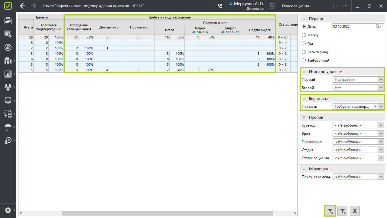 Чтобы увидеть информацию по каждому администратору, выберите фильтр «Подтвердил» в блоке «Итоги по уровням» и примените фильтр. Приемы без исходящей коммуникации попадают в строку «< Неизвестно >».