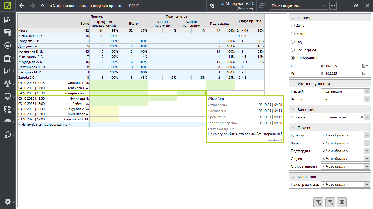 Отчет можно развернуть до пациента. Так вы наглядно увидите, что произошло с приемом пациента и сможете разобрать конкретные ситуации.