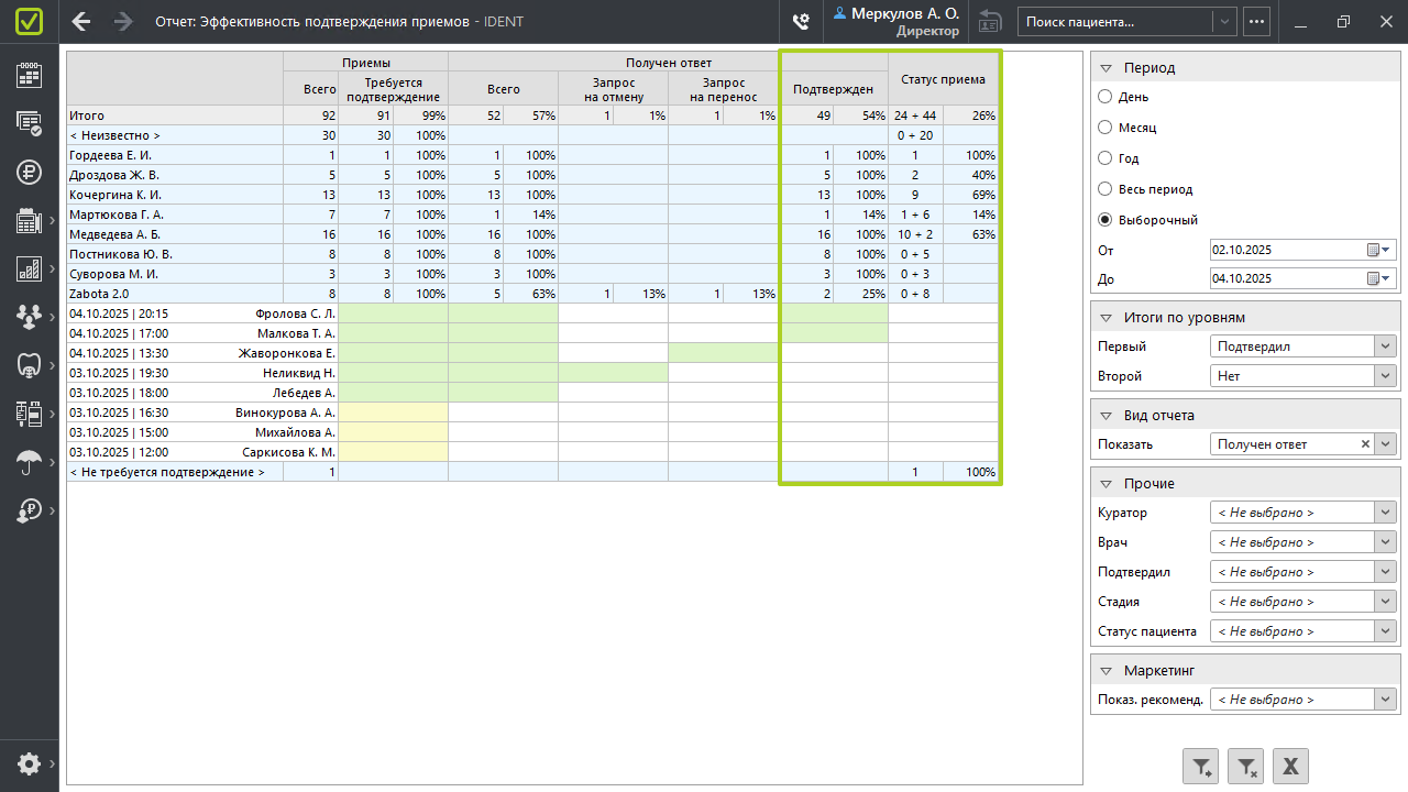 - увидеть, кто из сотрудников лучше справляется с подтверждением приемов;
