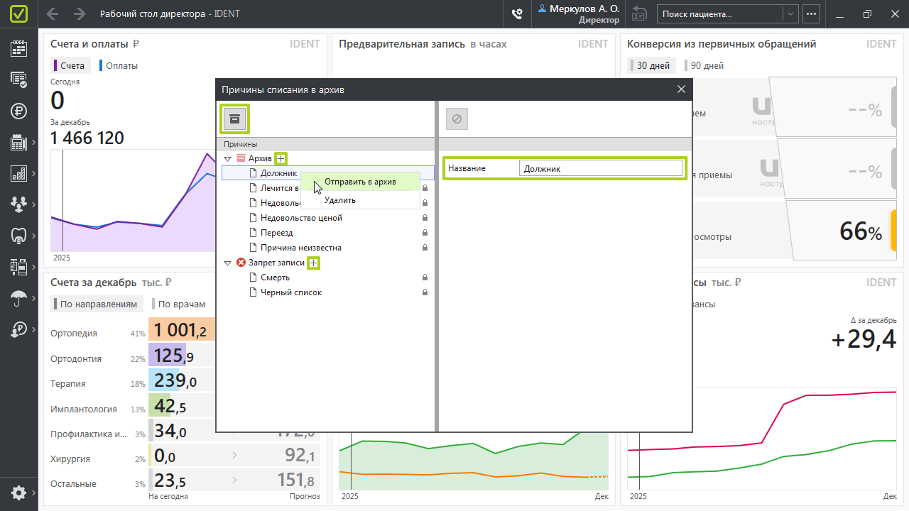 Если вы не работаете по какому-то направлению, можете перенести его в архив, нажав на него правой кнопкой мыши. В любое время можно посмотреть архивные направления работы клиники и вернуть их в список.