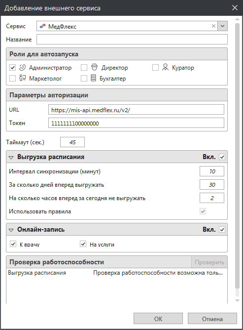 У вас также есть возможность задать параметры интеграции для собственного сервиса клиники.