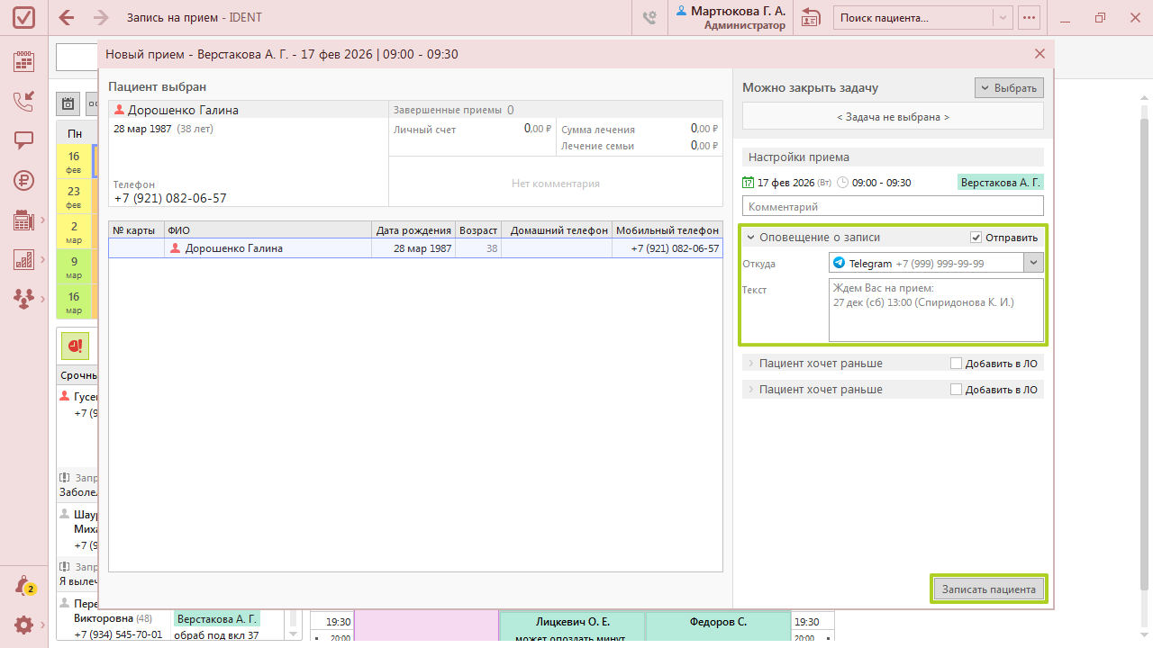 - Когда все готово, нажмите «Записать пациента». Оповещение автоматически отправится пациенту.