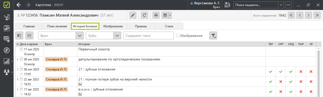 У врача с этим правом в разделе «Проверка историй болезни» появляется фильтр по врачу и столбец с фамилией врача. По умолчанию в фильтре стоит текущий пользователь, но сотрудник может нажать «Врач» и посмотреть все случаи обслуживания или выбрать любого врача.