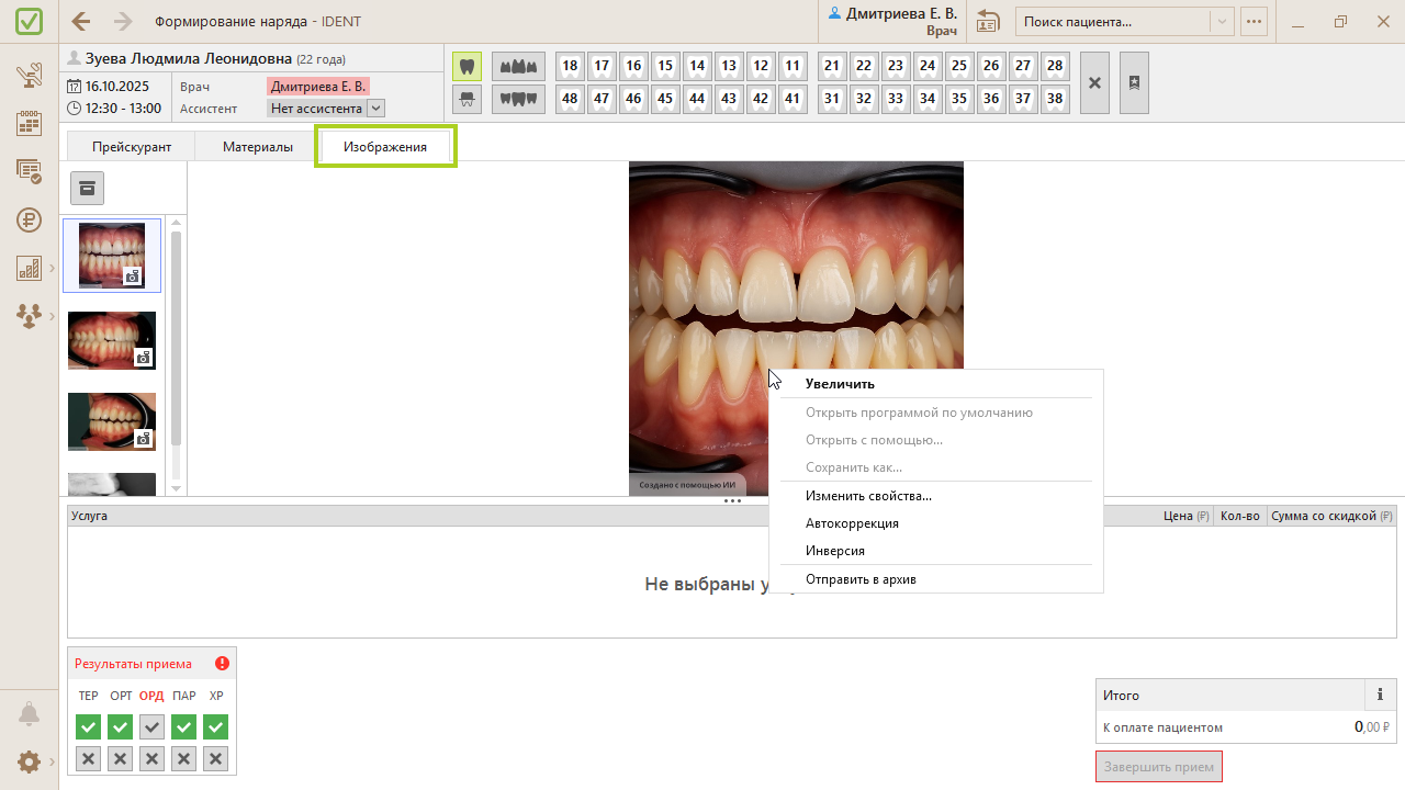 Проверьте, что отметили все зубы и услуги. Если добавили услугу случайно, нажмите по ней правой кнопкой мыши → «Удалить». Если ошиблись в номере зуба или, наоборот, выбрали не ту услугу, нажмите правой кнопкой мыши → «Изменить» и отредактируйте.