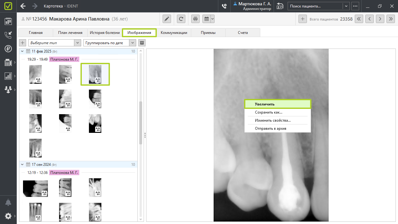 Щелчком левой кнопкой мыши сотрудник выбирает пациента, чей снимок сделал. Таким образом проводится привязка данных в двух базах — рентген-программы и IDENT. Этот и предыдущие снимки пациента автоматически загрузятся в карточку в IDENT.