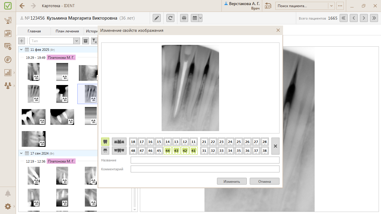 Можно изменить свойства снимка: указать челюсть или номер зуба, ввести название и комментарий. Для этого нажмите правой кнопкой мыши по снимку → «Изменить свойства…».