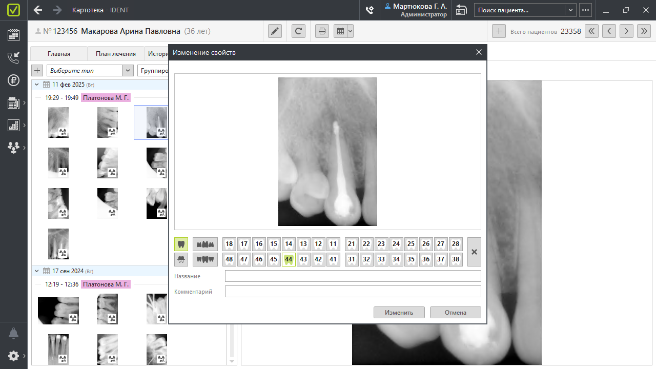 Можно изменить свойства снимка: указать челюсть или номер зуба, ввести название и комментарий. Для этого нажмите правой кнопкой мыши по снимку → «Изменить свойства…».