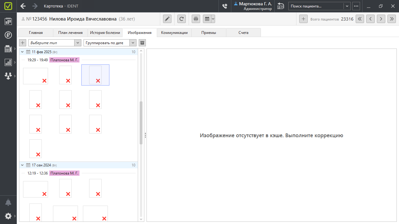 Используется, если на вкладке «Изображения» вместо снимка обнаружили красный крестик ❌. Он возникает, когда снимок в кэше IDENT удален, поврежден или перемещен. Чаще всего это происходит, когда снимок удаляется из базы рентген-программы.