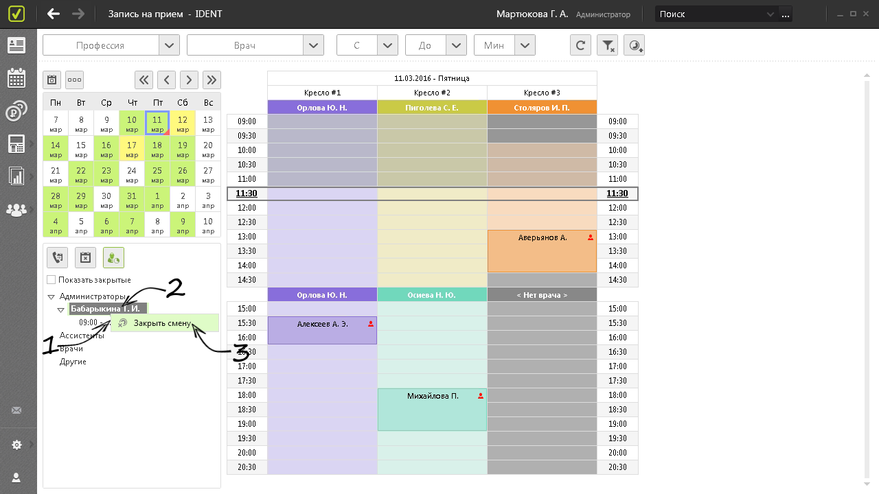 Наличие зеленого уголка (1) у смены означает, что к этой смене был оставлен комментарий. Чтобы закрыть текущую смену, нажмите правой кнопкой мыши на фамилию сотрудника (2) и выберите «Закрыть смену» (3).