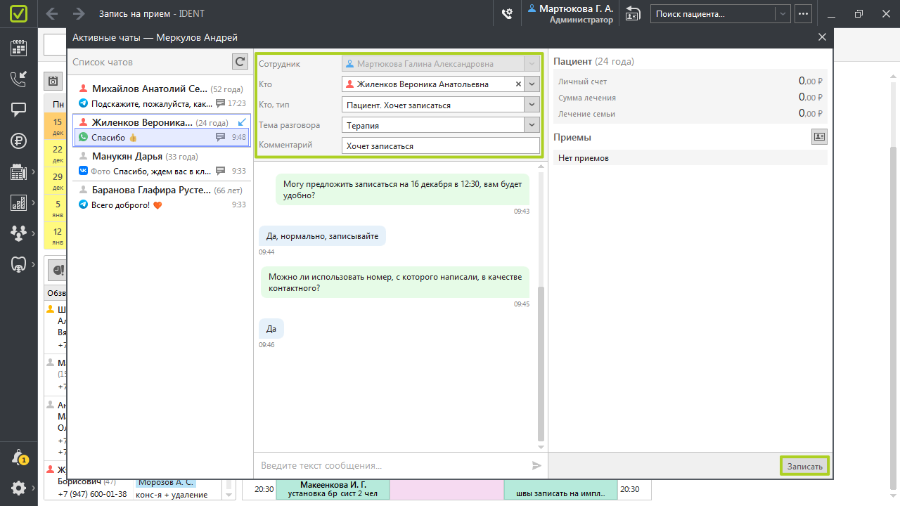 Когда вы заполните эти поля, чат закрепится за вами. Действия с приемами, которые вы совершите при переписке с пациентом, попадут к вам в конверсию. Конверсия администраторов
