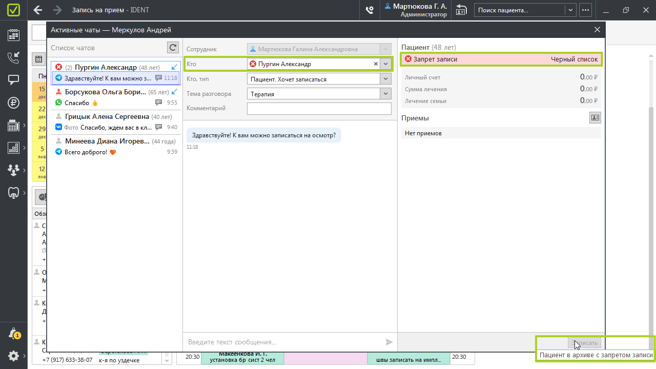с запретом записи. Например, если вам написал пациент в архиве, в программе отобразится соответствующая иконка, а в блоке справа — причина списания в архив и информацией о личном счете, сумме лечения и приемах пациента.