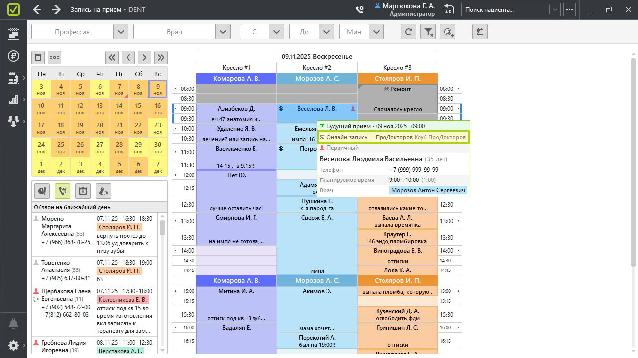 • в виджете «Обзвон на ближайший день» под календарем для оповещения пациентов о приемах;