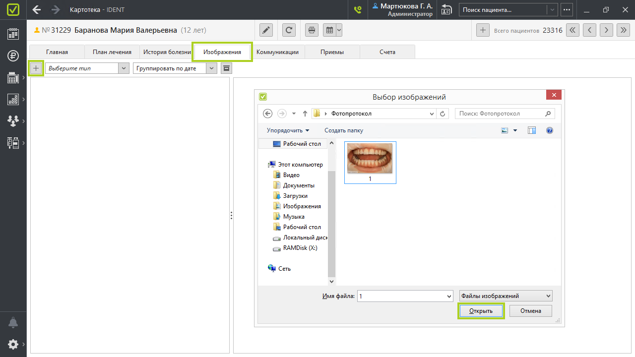 При синхронизации с рентгеном снимки загружаются в IDENT автоматически. Другие изображения, например фотопротоколы, можно добавить вручную. Обычно это делают врачи или ассистенты во время приема.