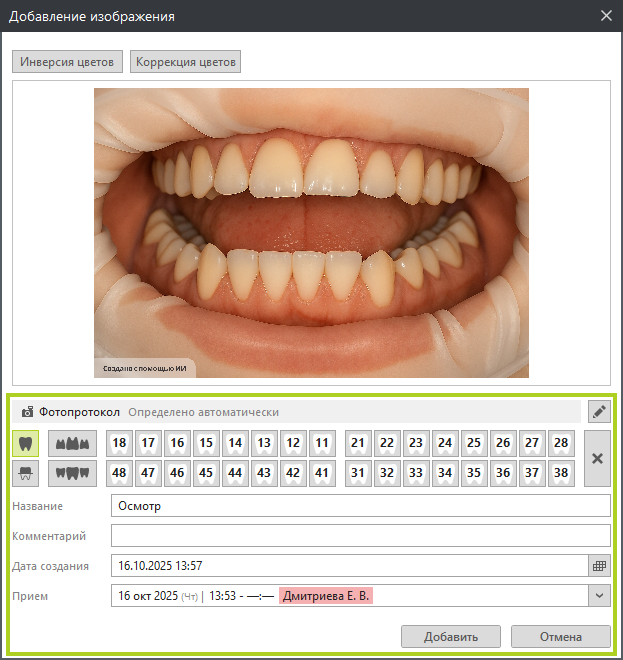 ❗ К приему привязываются только фотопротоколы и снимки. - На зубной формуле можно отметить зубы, челюсть или обе челюсти. В дальнейшем вы сможете отсортировать изображения по конкретному зубу и проследить его состояние в динамике.