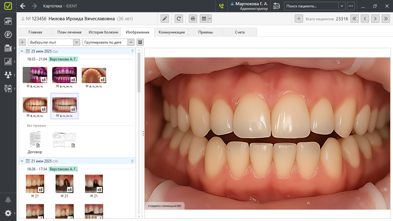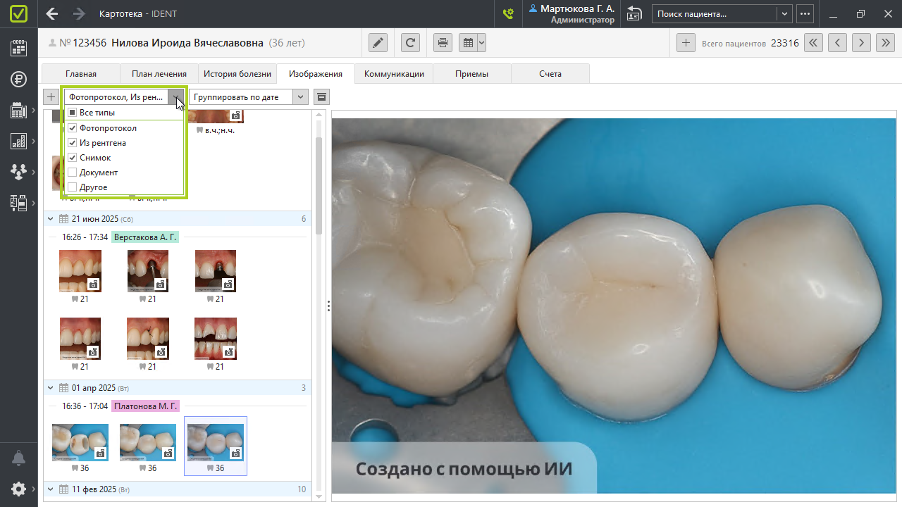 В IDENT фотопротоколы и рентен-снимки автоматически прикрепляются к приему, на котором были сделаны. Это позволяет сотрудникам видеть изображения в процессе работы во всех разделах, где это может пригодиться.
