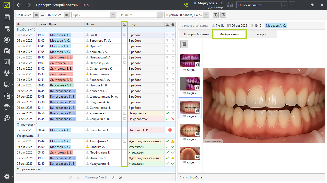 показывает, есть ли изображения для каждого случая обслуживания. Так можно быстро увидеть, какие врачи добавляют фотопротоколы и снимки, а кто этого не делает.