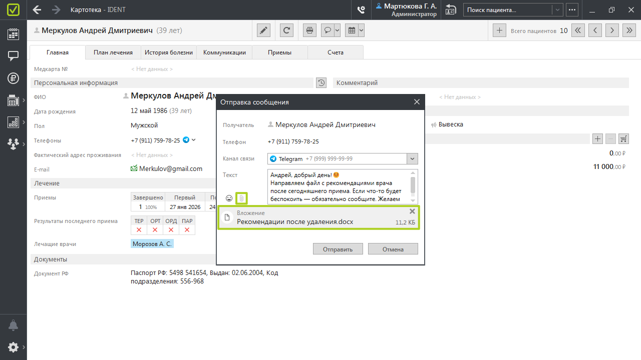 Теперь пациентам можно отправлять не только текстовые сообщения, но и файлы. Например, после приема администратор может выслать пациенту памятку, рекомендации или план лечения прямо в мессенджер — без перехода в другие программы.