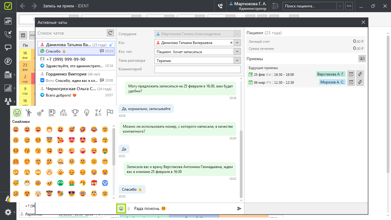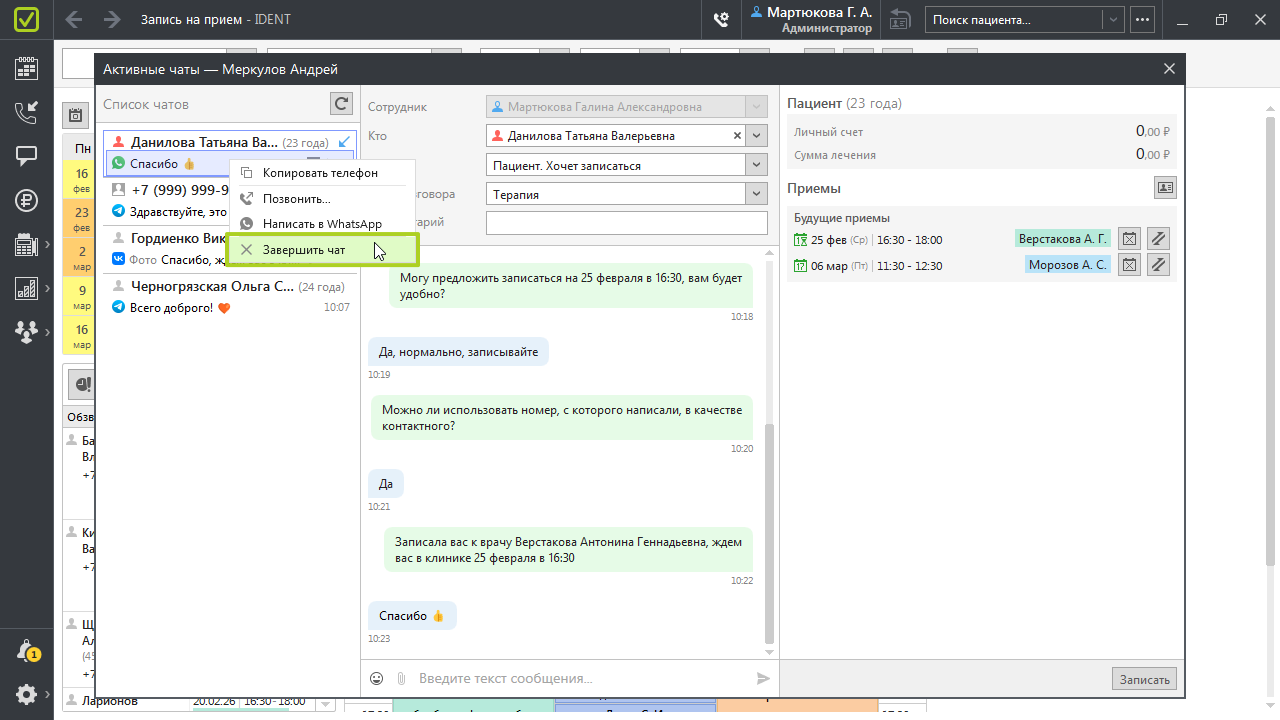 Если переписка с пациентом уже завершена, ее можно убрать из списка активных чатов. Для этого нажмите на нужный диалог правой кнопкой мыши и выберите «Завершить чат». Чистый интерфейс без сообщений, которые уже не требуют внимания, помогает администраторам сосредоточиться на важных коммуникациях.