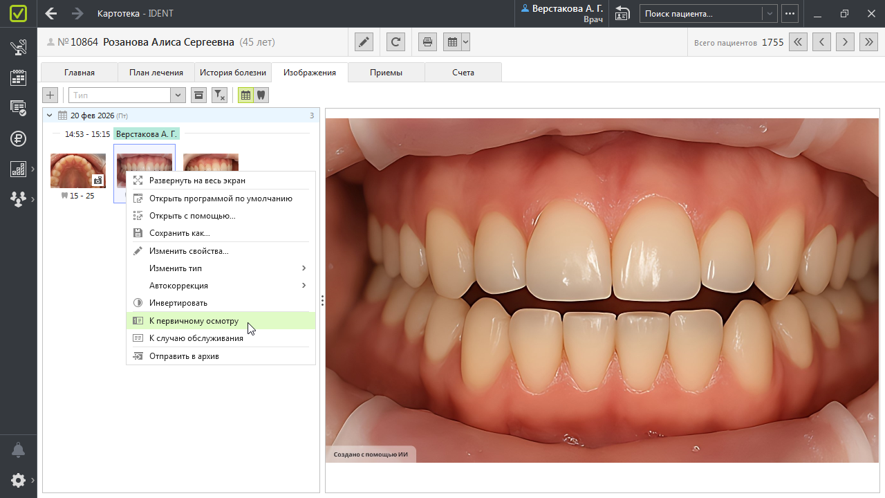 Связь осмотра с приемом упрощает контроль качества: главный врач может быстро перейти от изображения к документу и понять, какие данные были зафиксированы и какой диагноз поставлен. Так повышается прозрачность медицинской документации и снижаются риски для клиники.