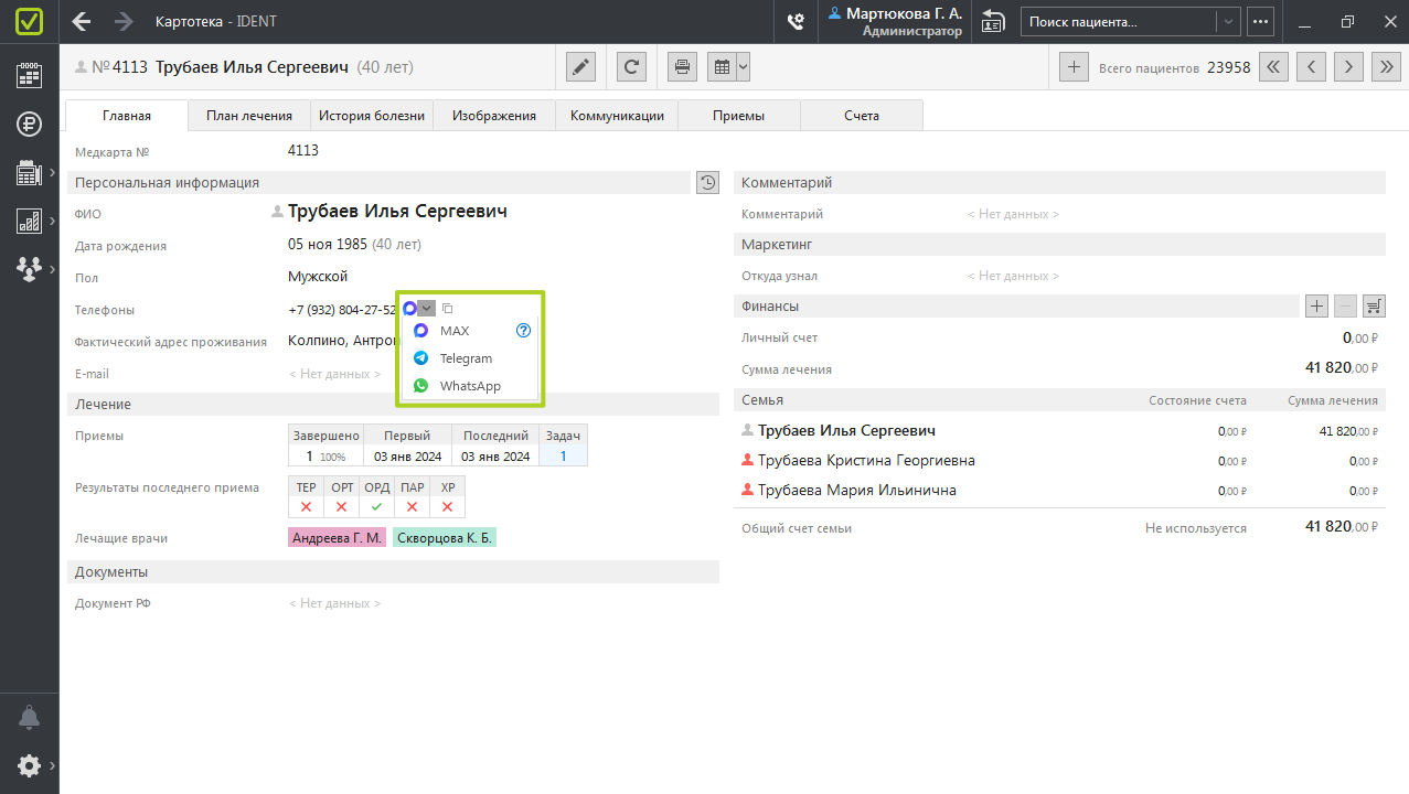 Вы можете начать общение с пациентом в MAX и Telegram прямо из его карточки. Для этого на вкладке «Главная» рядом с номером телефона: