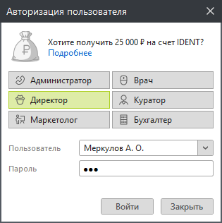 На верхней панели справа с символом сотрудника отображается, под какой ролью и учетной записью открыта программа. Если у вас общая база филиалов в IDENT, под ролью отображается название клиники, которую выбрали при входе.